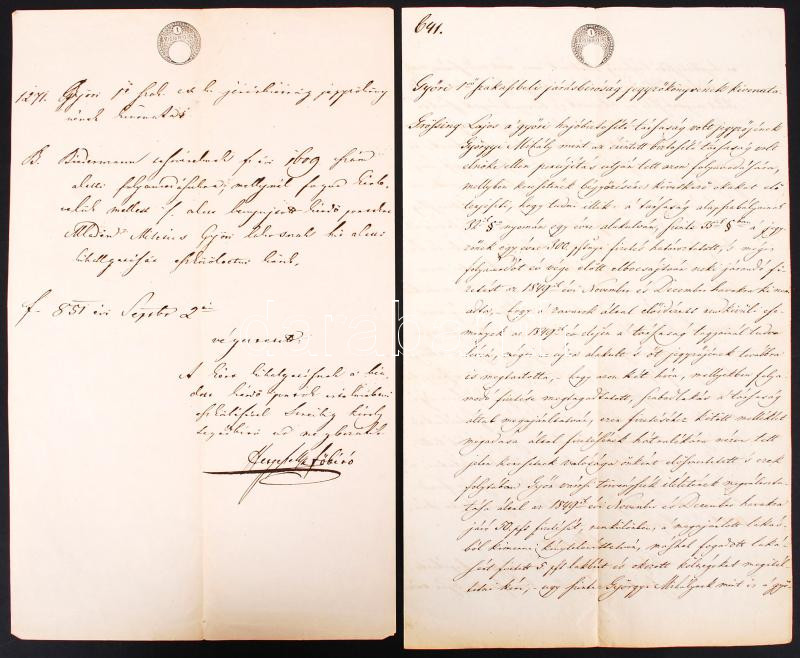 1851 Győr, Győri szakaszbeli járásbíróság jegyzőkönyvének kivonata 1 guldenes szignettás papíron, 2 db.