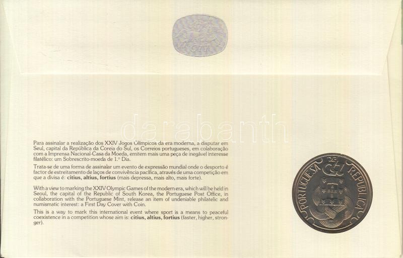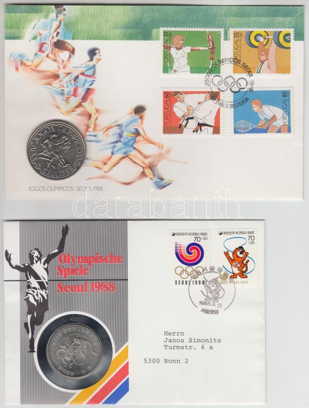 Description: Dél-Korea 1982. 1000W "Szöuli Olimpia" + Portugália 1988. 250Esc "Szöuli olimpia", mindkettő érmés borítékon elsőnapi bélyegzős bélyeggel, hátoldali ismertetővel T:BU