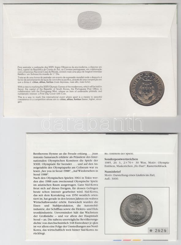 Dél-Korea 1982. 1000W "Szöuli Olimpia" + Portugália 1988. 250Esc "Szöu... https://www.darabanth.com/en/201-Online-auction/201.0/Numismatics/Envelopes-with-Coins-and-Banknotes~400004/Del-Korea-1982-1000W-Szouli-Olimpia-plus-Portugalia-1988-250Esc-Szouli-olimpia-mindketto-e~II794735