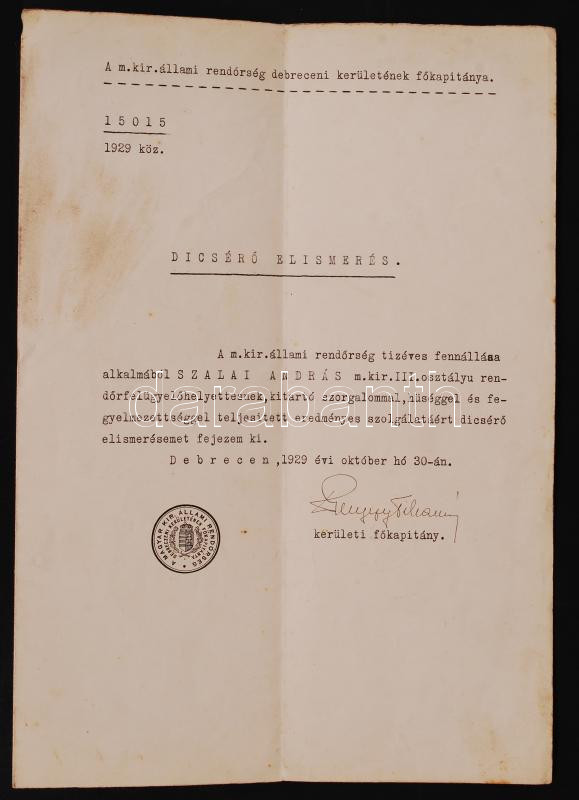 1929 Debrecen, Magyar Királyi Állami Rendőrség debreceni kerületének főkapitánya által kiállított dicsérő elismerés
