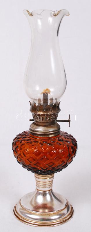 Petróleumlámpa, fém-üveg, tetején csorba, m:24 cm