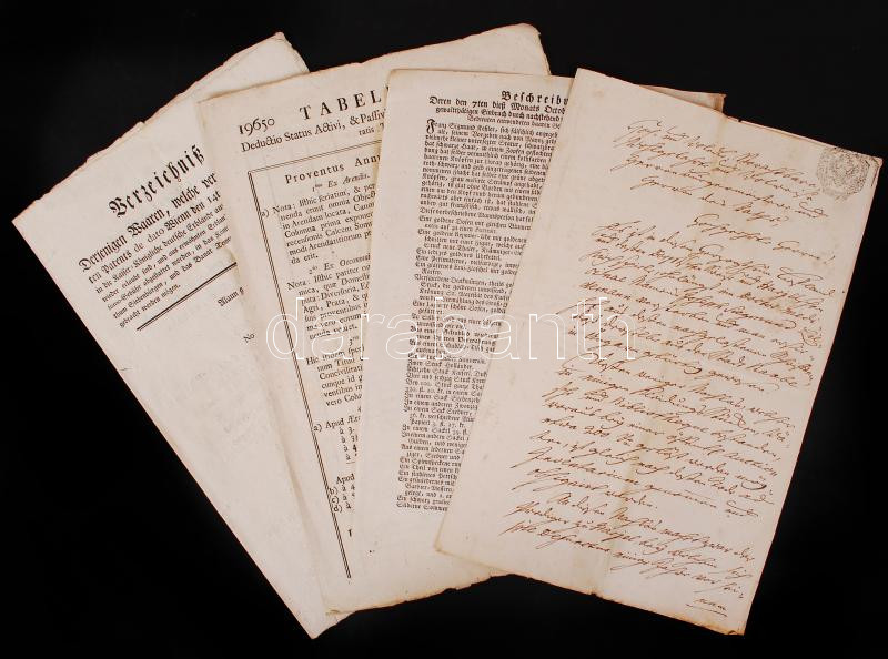 Description: 1769 Részletes leírás német nyelven egy betörés alkalmával ellopott tárgyakról és értékükről; 1774 Lista a megmelt behozatali vám alá eső árukról, vízjeles, merített papíron, német nyelven; 1779 Dorpat (Tartu, Észtország), Német nyelvű vízjeles okirat, laponként 2 kopekes litván szignettával; 1790 Latin nyelvű ártáblázat a szabad királyi városokra vonatkozóan, 3 oldal.