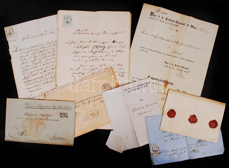 Description: 1850-1868 Vegyes iratok (árverési jegyzék, levél városi tanácsnak, törvényszéknek)illetékbélyegekkel; 1851 Levélborítékok viaszpecséttel (egyiken 5 egész viaszpecsét); 1858 Ex offo levelek Bécsből Győrbe (2 db).