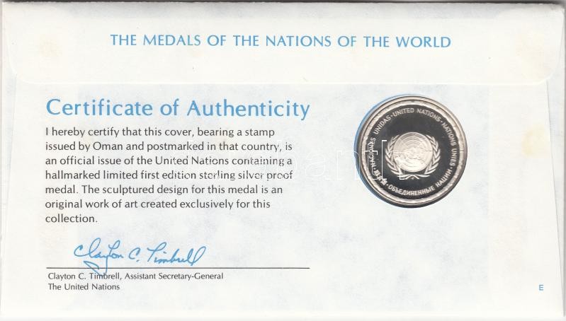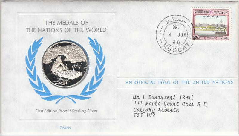 ENSZ 1980. "A Világ nemzeteinek emlékérmei - Omán" Ag emlékérem (15g/0.925/32mm) megcímzett érmés borítékon elsőnapi bélyegzős bélyeggel, hátoldali tanúsítvánnyal, ismertetőkkel T:PP
