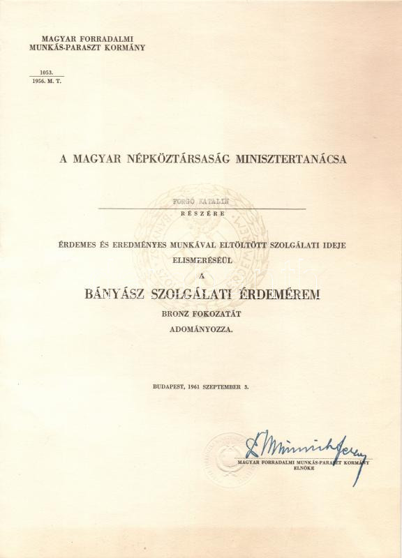 1961. "Bányász Szolgálati Érdemérem" kitüntetés adományozói oklevele Dr. Münnich Ferenc (1886-1967) aláírásával
