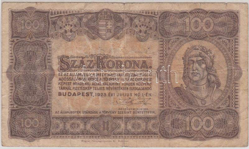 1923. 100K "Magyar Pénzjegynyomda Rt. Budapest" T:III