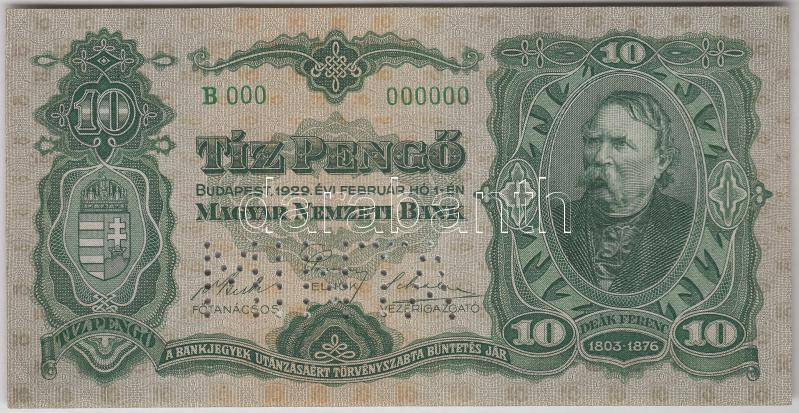 1929. 10P "Deák" "B 000 - 000000" sorozat és sorsz... https://www.darabanth.com/en/202-Online-auction/202.0/Numismatics/Hungarian-Banknotes~600008/1929-10P-Deak-B-000--000000-sorozat-es-sorszammal-illetve-vizszintes-MINTA-perforaciov~II805029