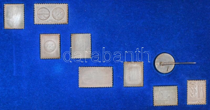 Description: 1979-1980. Az Állami Pénzverő által kiadott teljes ezüst bélyegérem gyűjtemény fa dísztokban 8db klf darabbal és egy kitűzővel! T:PP R!