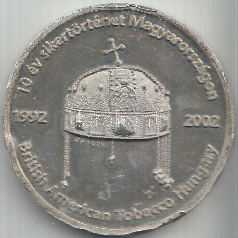 2002. "10 év sikertörténet Magyarországon / British American Tobacco Hungary" piefort Ag emlékérem (62.23g/0.925) T:P erős ph.