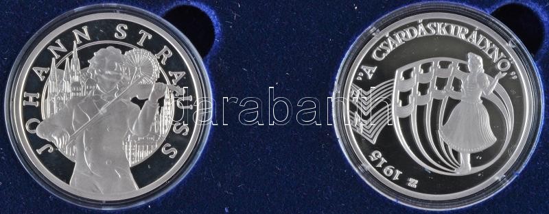 Description: A Magyar Pénzverő és a Münze Österreich közös kiadványa: 2008. "Kálmán Imre - Csárdáskirálynő" és "Johann Strauss - A Denevér" Ag(0.999) (20g/40mm) Csak 700-1000db, tanúsítványokkal!!