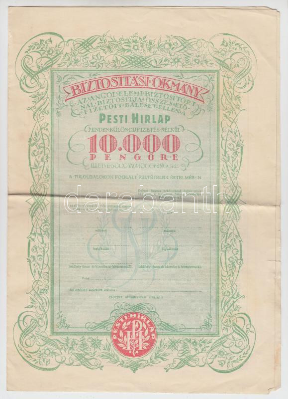 https://www.darabanth.com/en/202-Online-auction/202.0/Numismatics/Shares-and-Tickets~600006/7E1930-Pesti-Hirlap-biztositasi-okmany-10000P-ertekben-kitoltetlenul-TII-~II805184