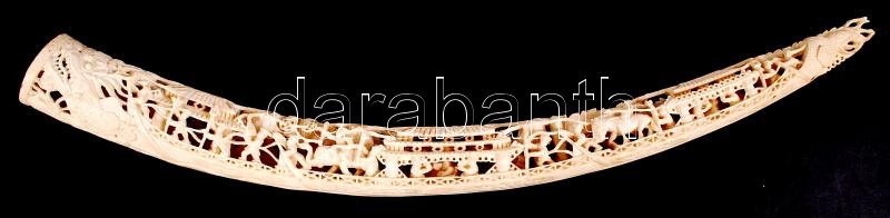 Antik sárkányhajót bemutató faragott agyarcsont, apró sérüléssel, jelzés nélkül, h:54 cm / Antique dragonship fang, hand made, small cracked