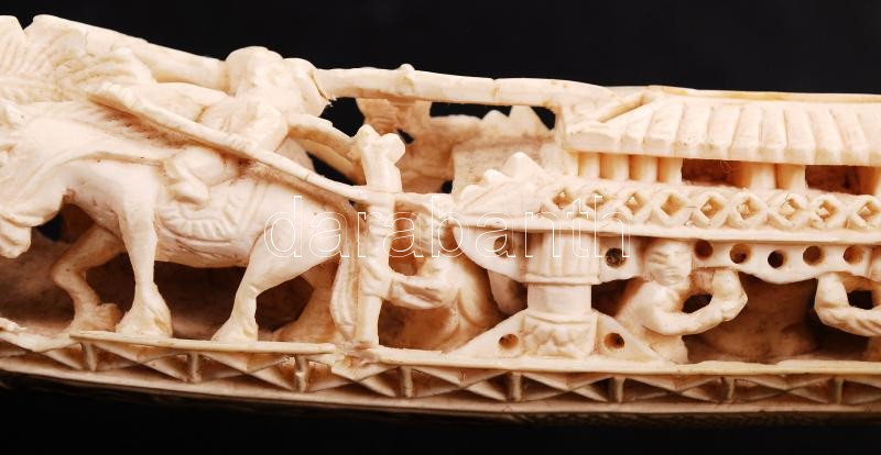 Antik sárkányhajót bemutató faragott agyarcsont, apró sérüléssel, jelz...