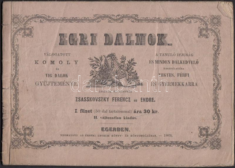 Zsasskovszky Ferencz és Endre: Egri dalnok I. füzet Válogatott komoly és víg dalok gyűjteménye. Eger, 1869. Érseki lyceum.