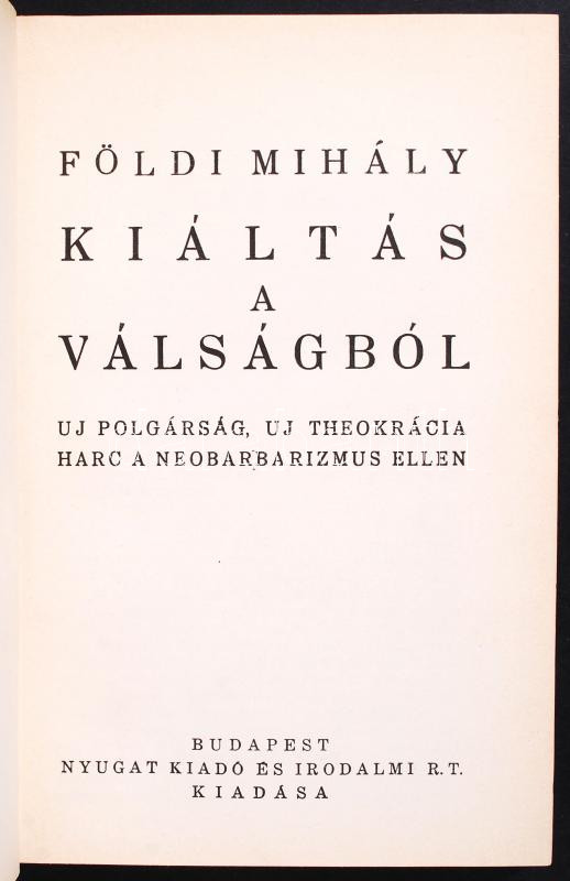 Földi Mihály: Kiáltás a válságból Uj polgárásg, uj theokrácia, harc a neobarbarizmus ellen Bp., é.n. Nyugat