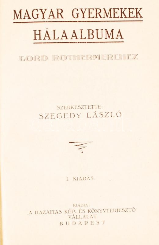 Szegedy László (szerk.): Magyar gyermekek hálaalbuma Lord Rothermerehe... https://www.darabanth.com/en/202-Online-auction/202.0/Other-collectibles/Books-Other-rarities~200036/Szegedy-Laszlo-szerk-Magyar-gyermekek-halaalbuma-Lord-Rothermerehez-I-kiadas-Bp-Hazafia~II801655