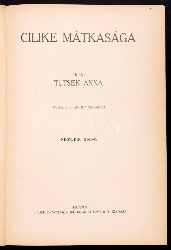 Tusek Anna: Cilike mint asszony. Mühlbeck Károly rajzaival. Negyedik k... https://www.darabanth.com/en/202-Online-auction/202.0/Other-collectibles/Books-Other-rarities~200036/Tusek-Anna-Cilike-mint-asszony-Muhlbeck-Karoly-rajzaival-Negyedik-kiadas-Bp-Singer-es-Wolf~II802543