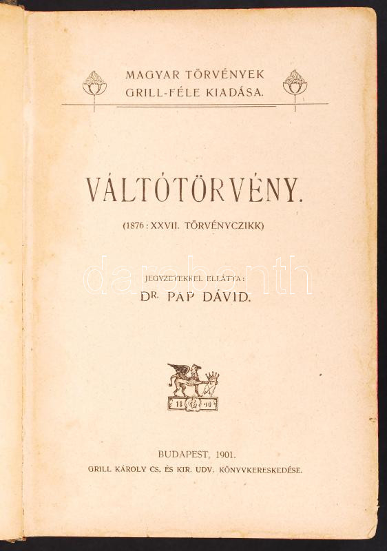 Váltótörvény (1876: XXVII. törvényczikk). Jegyzetekkel ellátta: Dr. Pap Dávid. Magyar törvények Grill-féle kiadása. Bp., 1901, Grill Károly. Kiadói egészvászon kötés, kopottas állapotban.