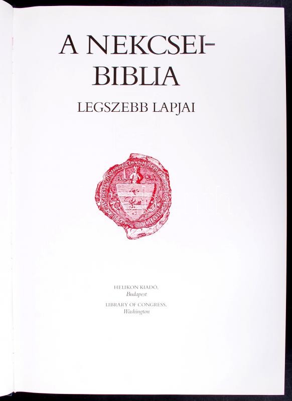 Description: A Nekcsei-Biblia legszebb lapjai. A bevezetőt Dana J. Pratt, a képmagyarázatokat Levárdy Ferenc írta. Hozzá:angol nyelvű kísérőfüzet és egy lap poszter-változata. Bp-Washington, 1988. Helikon-Library of Congress. 231 l. 320x460 mm.Kiadói bársonykötésben és eredeti illusztrált papír-tékában, jó állapotban