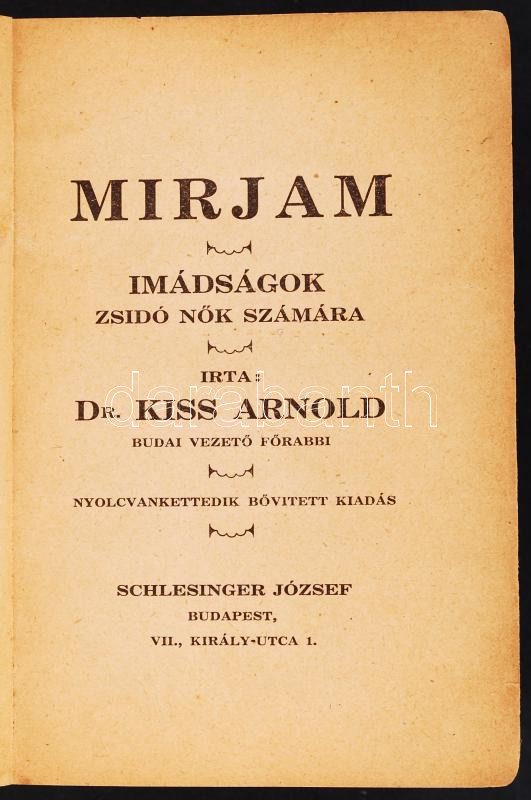 Dr. Kiss Arnold: Mirjam. Imádságok zsidó nők számára. 82. bővített kia... https://www.darabanth.com/en/202-Online-auction/202.0/Other-collectibles/Books-Religion~200018/Dr-Kiss-Arnold-Mirjam-Imadsagok-zsido-nok-szamara-82-bovitett-kiadas-Schlesinger-Jos~II784236