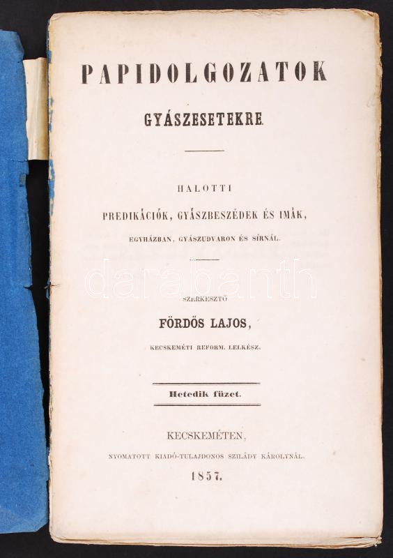 Fördös Lajos (szerk.): Papidolgozatok gyászesetekre. Halotti predikációk, gyászbeszédek és imák, egyházban, gyászudvaron és sírnál. Kecskemét, 1857, Szilády Károly. Papírkötés, gerincnél szakadt, viseltes állapotban.