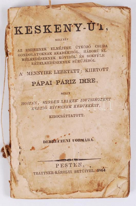 Pápai Páriz Imre: Keskeny-út, mellyet az embernek elméjébe ütköző tsuda gondolatoknak akadekiból, háború elmélkedéseknek köveiből, és sokféle kételkedéseknek sűrűjéből, a mennyire lehetett, kiirtott - -... Debreczeni formára. Pesten, 1864, Trattner-Károlyi betűivel. Romos állapotban, hiányos (!) (cca utolsó 20 oldal hiányzik)