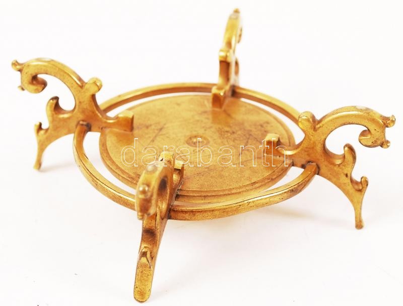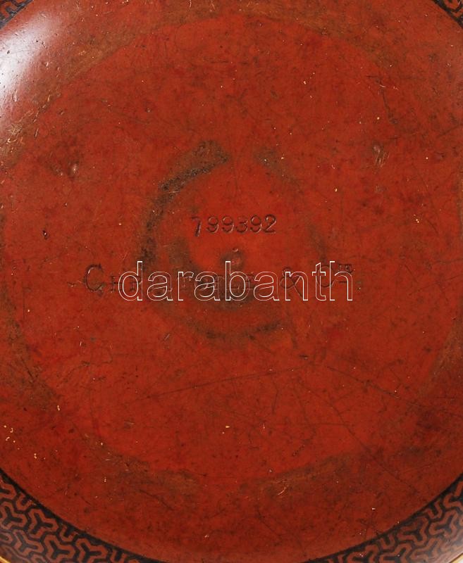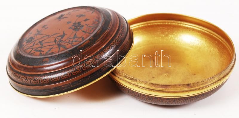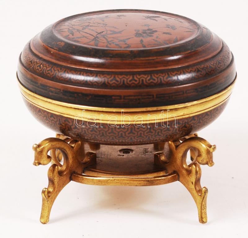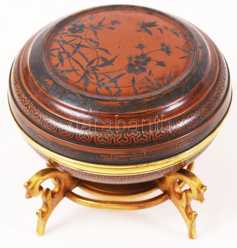 Christofle & Cie ékszeres dobozka, zománcozott réz, réz lábakon, kopott, jelzett, d:8,5 cm, m:6 cm
