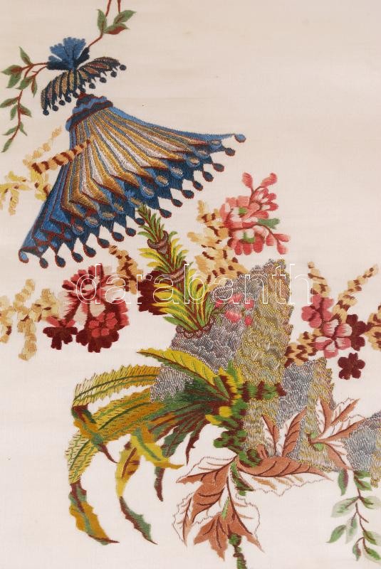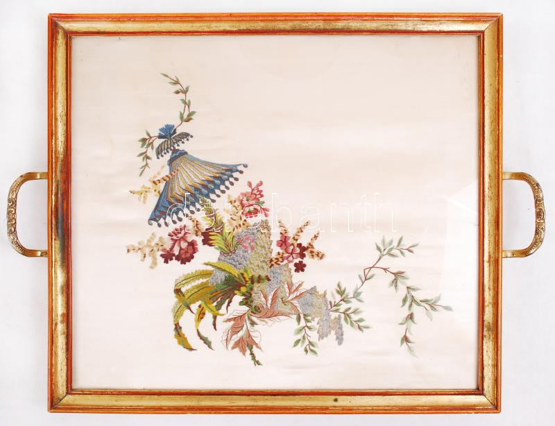 Képkerethez hasonlító fémfüles tálca, belsejében hímzett selyem díszít...