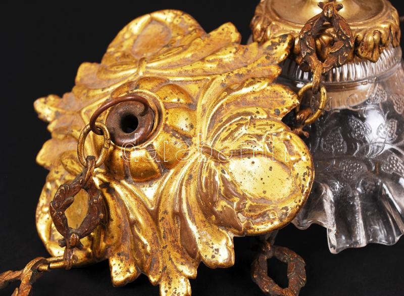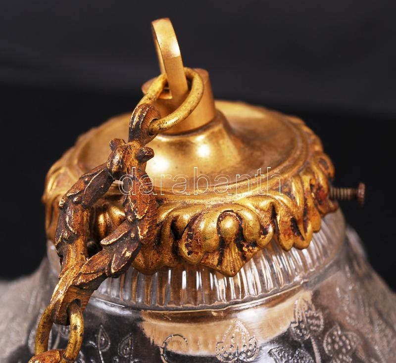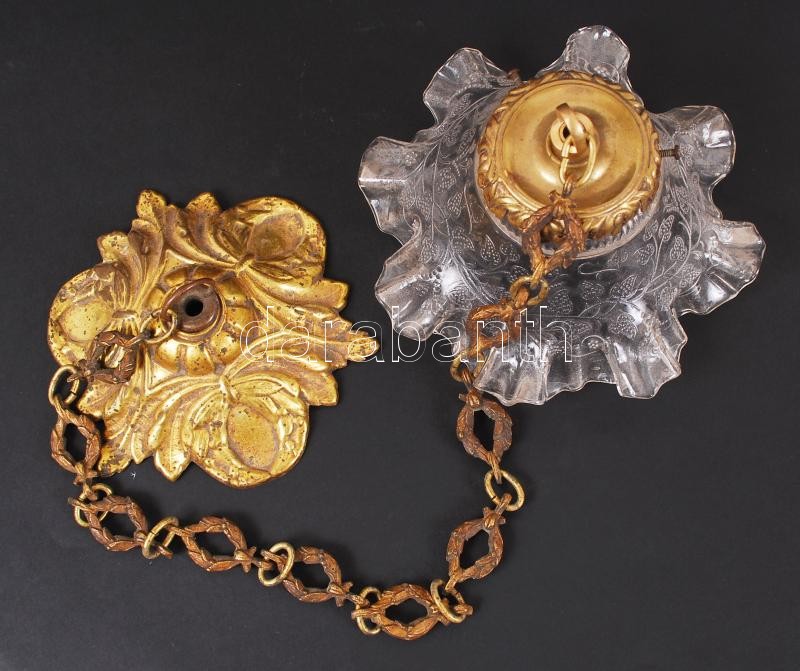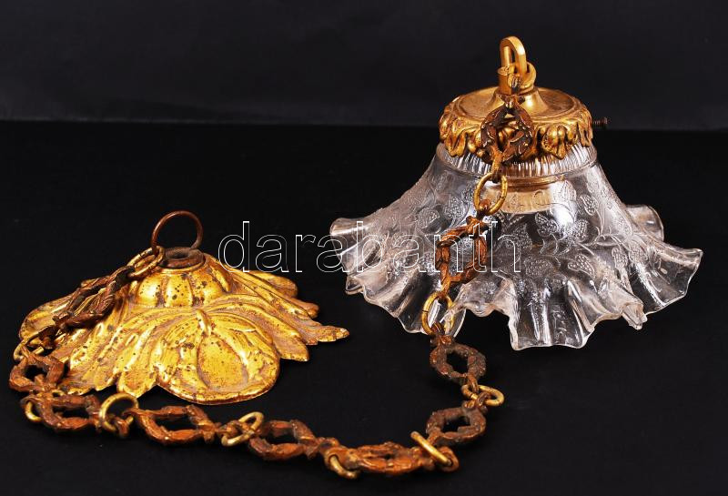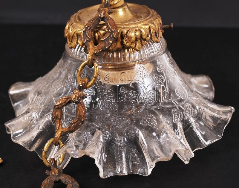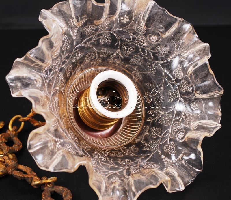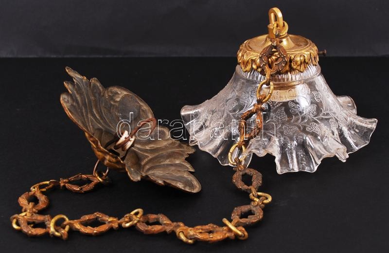 Mennyezeti lámpa, hibátlan üveg díszített búrával, réz, h:60 cm