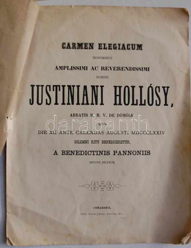 1874 Carmen Elegiacum honoribus amplissimi ac reverendissimi domini Justiniani Hollósy abbatis b.m.v de Dömölk, quum die XII ante calendas augusti MDCCCLXXIV solemni ritu benediceretur, a Benedictinis Pannoniis devote dicatum. Comaromii, Caroli Siegler. Üdözlő vers Hollósy Jusztinián dömölki apát tiszteletére