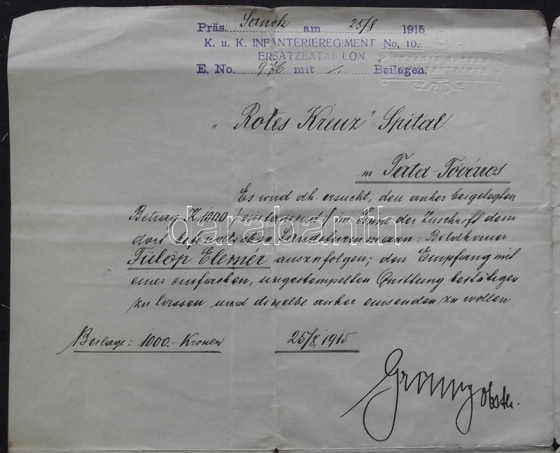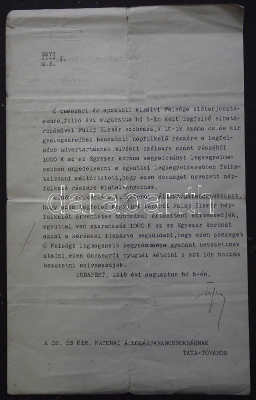 1915 Fülöp Elemér szobrásznak 1000K császári adományt juttató levél Tisza István miniszterelnök saját kezű aláírásával