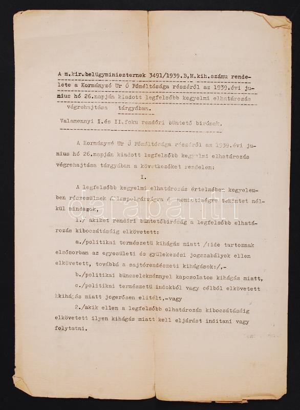 1939 Végrehajtási utasítás a Kárpátalja visszatérte miatt kiadott politikai bűncselekményekre adott amnesztia tárgyában 3 gépelt oldal, kis szakadásokkal