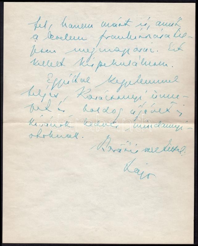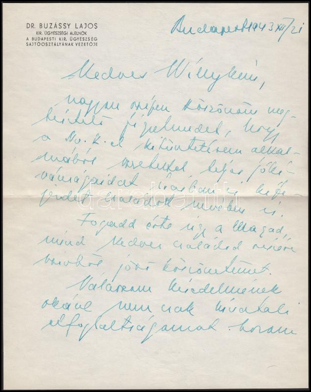 1943 dr. Buzássy Lajos, kir. ügyészségi alelnök a Bp.-i. Királyi Ügyészség sajtóosztálya vezetője saját kézzel írt levele