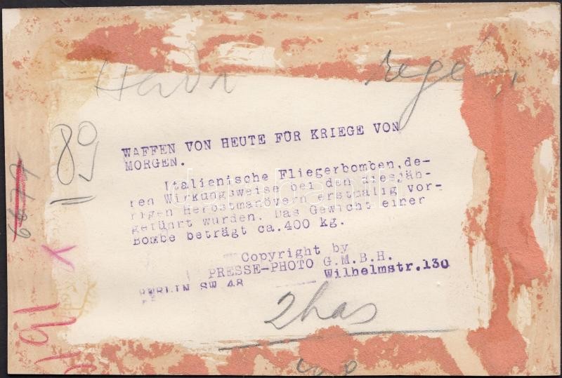 cca 1914-1918 Olasz 400 kg-os bombák bevetés előtt, németül feliratozv...