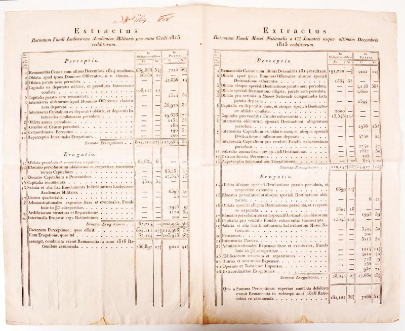 Description: 1815 A Nemzeti Múzeum felállítására szánt pénzalap, a nemesi felkelés kincstára, az Országos Pénztár és a Ludovika Akadémia pénzügyi latin nyelvű kimutatásai