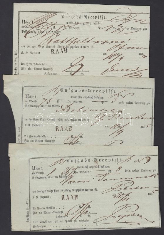 1864-1866 Győr, német nyelvű feladóvevények Raab (Győr) csíkbélyegzővel, 5 db.