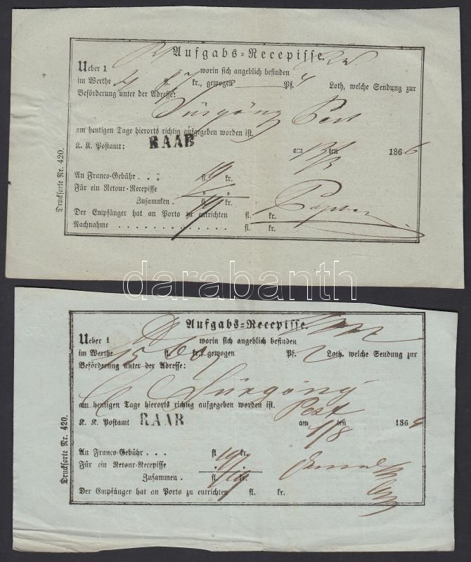 1864-1866 Győr, német nyelvű feladóvevények Raab (Győr) csíkbélyegzőve...
