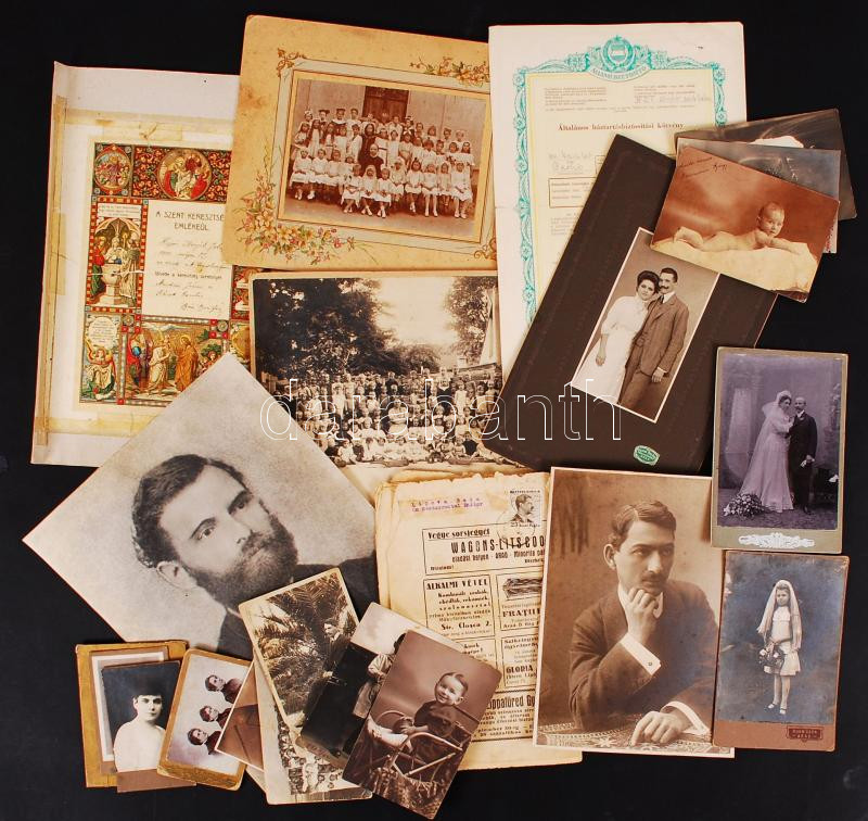 cca 1890 18 db főleg keményhátú fotó, egy díszes litho, de szakadt oklevél, és néhány irat