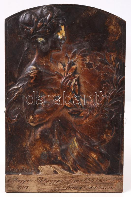 1927 Heinrich Kautsch (1859-1943): Magyar Bélyeggyűjtő Egyesületek Szövetsége fém dombormű Rédey Miklós részére. Jelzett. 13x21 cm