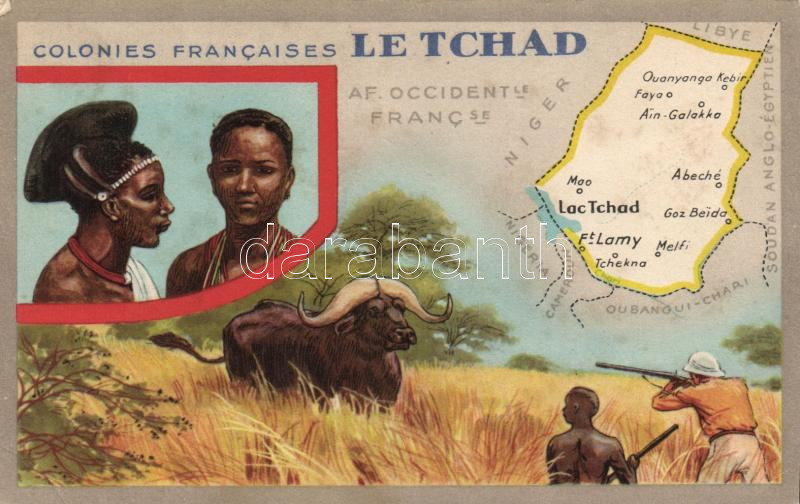 French colonies, Chad, Lake Chad, folklore, buffalo hunting, map, description on the back side (EB)