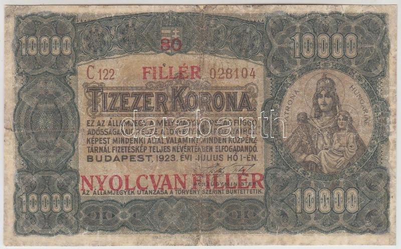 https://www.darabanth.com/en/203-Online-auction/203.0/Numismatics/Hungarian-Banknotes~8/1923-10000K-Orell-Fussli-Zurich-80-FILLER-NYOLCVAN-FILLER-felulbelyegzessel-Trestaura~II811989