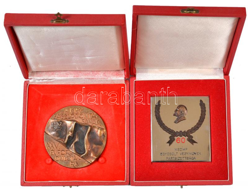 1982. "KISZ Zászlóbontásának XXV. évfordulójára" Br plakett (90mm) dísztokban + "MSZMP Egyesült Vegyiművek Pártbizottsága 60 éves szolgálatért járó plakett dísztokban T:1