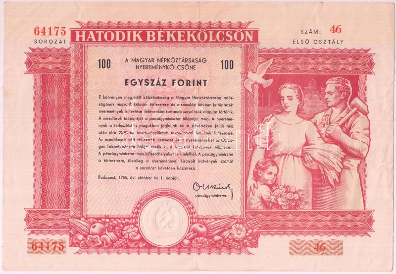 Budapest 1955. "Hatodik Békekölcsön" nyereménykölcsöne 100Ft-ról T:II-
