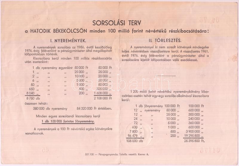 Budapest 1955. "Hatodik Békekölcsön" nyereménykölcsöne 100Ft...