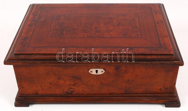 Restaurált biedermeier stílusú asztali doboz, nemes fa, intarziás, kulcs nélkül, 32×23 cm, m:11 cm