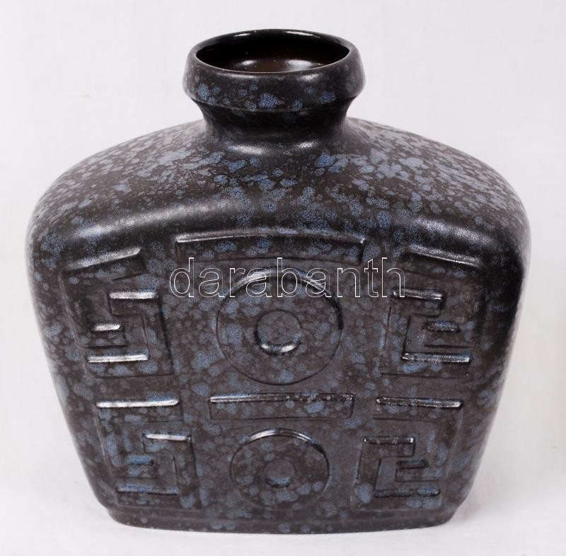 Fekete-szürke dombormintás kerámia váza, jelzett, m: 19 cm