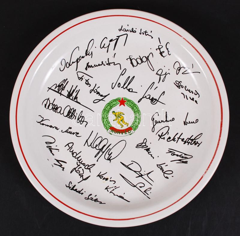 Cca 1985 Bp. Honvéd labdarúgói által aláírt, hollóházi porcelán tál, d...