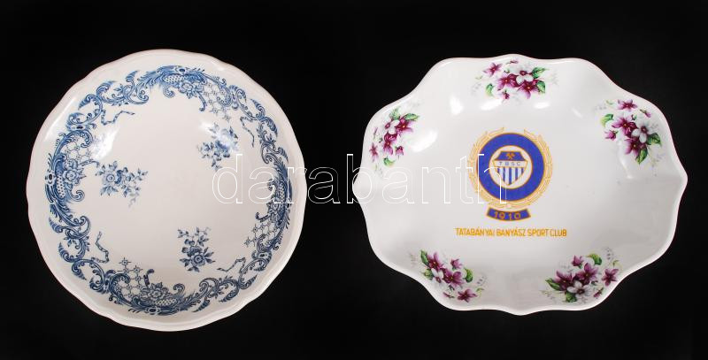 2 db porcelán tálka-Villeroy & Boch jelzéssel, hibátlan, mintás porcelán tálka, d: 15 cm; hollóházi porcelán, hibátlan, jelzett, virágmintás tálka Tatabányai Bányász Sport Club cÃmerrel, 17x14 cm