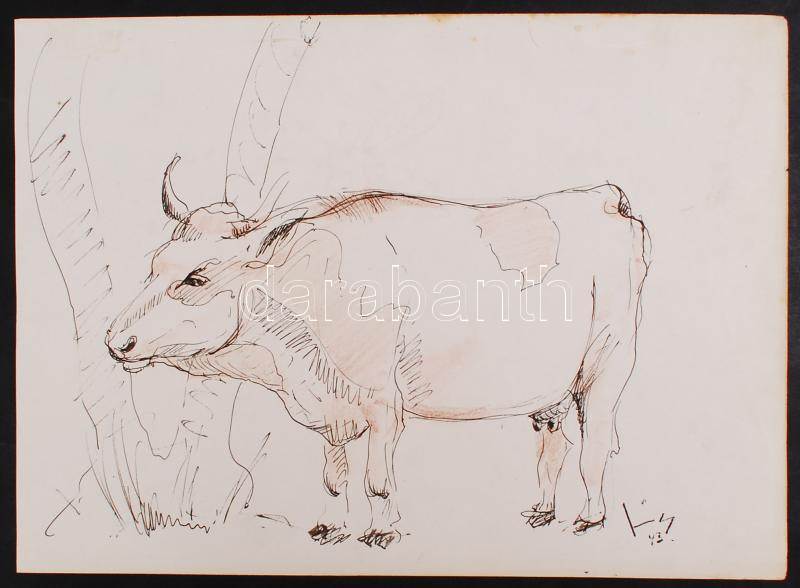 Szőnyi Jenő (1902-?): Tehén. Toll-színes ceruza, papír, jelzett, 20×27...