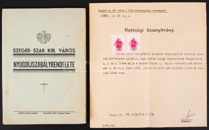 Description: 1861, Plakát Csongrád megyei telekkönyvi ügyekről; 1943 Hatósági bizonyítvány illetékbélyegekkel; 1945 Szeged szabad királyi város nyugdíj-szabályrendelete.